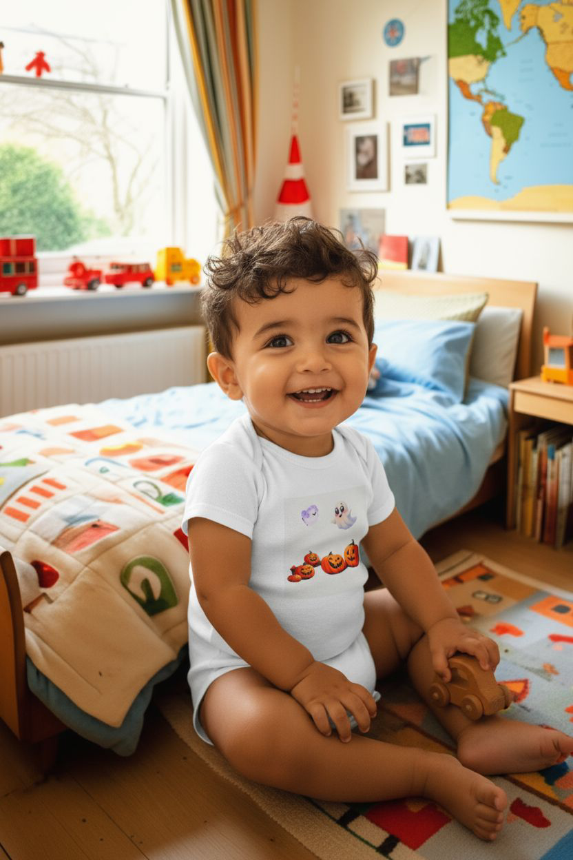This Halloween-themed bodysuit is perfect for the little ones who love the holiday. The design captures the fun and excitement of Halloween, making it a great addition to any baby's wardrobe. Ideal for infants, this bodysuit is made of soft and comfortable fabric, ensuring a cozy fit for the little trick-or-treaters. Perfect for Halloween celebrations and costume parties.